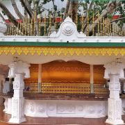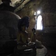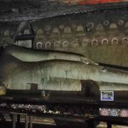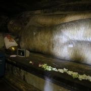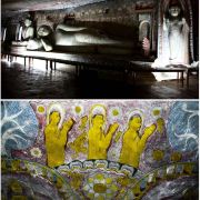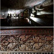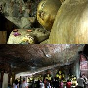 里面有15米长的卧佛,由整块岩石雕刻而成。卧佛的脚下是阿难尊者以及其他坐佛像,而卧佛的头顶上一个小佛龛里放着毗湿奴。洞内的石壁及顶部都布满了精美的壁画。