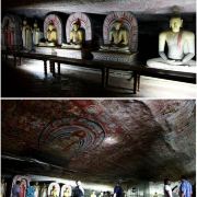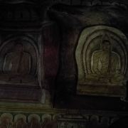 二号洞入口处有高大的拱门,两侧装饰有龙纹雕刻图案,东西长52米,从大门到墙纵深23米。你可以看到16尊立像与40尊坐像、2尊印度神像及2尊国王像,在石窟中间还有一座舍利塔。这座洞是以室内的两个国王塑像而命名的。进门后,左手边有一座上了色的木制雕像,那是Valagamba国王,而更里面一点的地方还有另一座雕像,是尼桑卡马拉国王。这座洞的雕像还曾经被金色树叶覆盖着,位于一座makara torana(有龙饰的拱门)下。这座佛像的右手举起,摆出了大无畏的手印(表示保护的意思)。印度诸神也是用这个手势表达“保护”的。洞窟的壁画中有一些是2000多年以前的作品,至今仍然栩栩如生。
