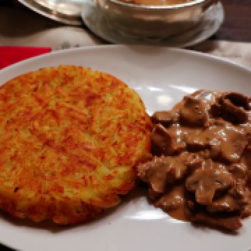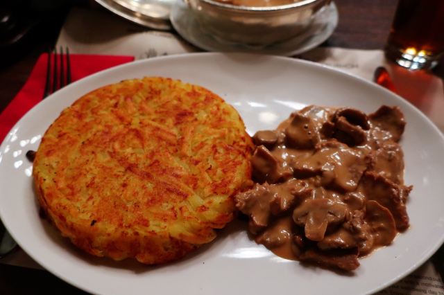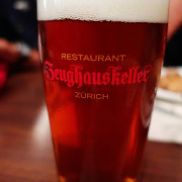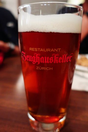 这是当天晚上我们用餐的地方,开在一个军械库地窖内,至今墙上还有真强实弹装饰。这家餐厅最赞的是居然有中文菜单,但是你必须要向服务员索取才会拿给你。我们两个人点了一份招牌的苏黎世小牛肉和奶酪猪排,还有一杯地道的自酿黄啤,真的味道很不错,推荐各位来苏黎世的朋友一定要去试试。