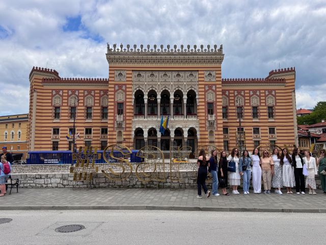 4分 满意去萨拉热窝,顺便去市政厅参观了一下,碰上一群学生正在那个网红楼梯上摆pose,忍不住也摆了一张,感觉世界人民本质上是一样的,应该能成为好朋友。但事实是,巴尔干半岛被称为“欧洲的火药桶”!