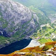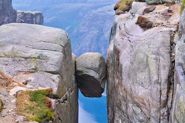 Kjerag是挪威知名的自然景观之一,山体陡峭而崎岖,大部分都被岩石覆盖,其中一块儿被夹在两个悬崖之间的巨石是这里的一大特色,吸引了大量游客前来参观。