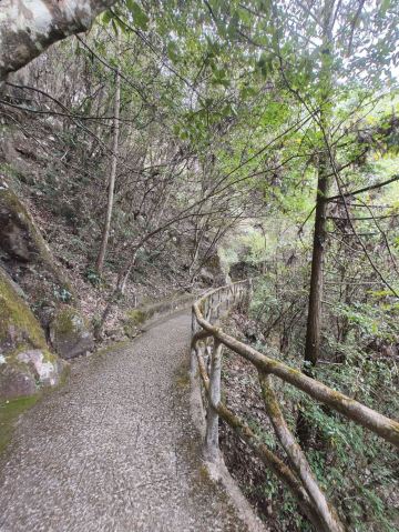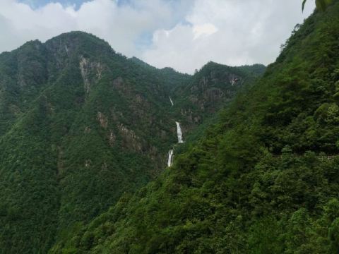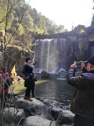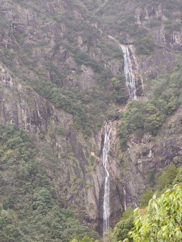 二级瀑有路通往瀑底,可以走到下面拍照。后面的第三级瀑布落差很大,从百米高的悬崖上飞流而下,很壮观。不过这只能走到对面远观了,人站在观瀑台隔谷相望,如坠云雾间。后面的游程以红军为主题,走在栈道上往下看,能看到山间的森林与梯田,景色宜人。