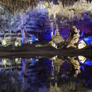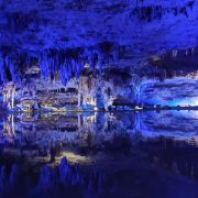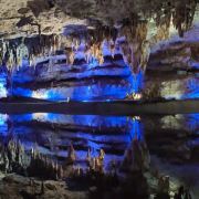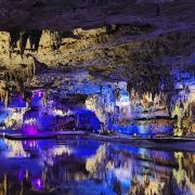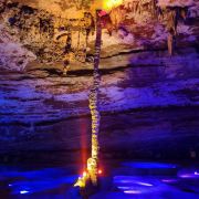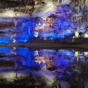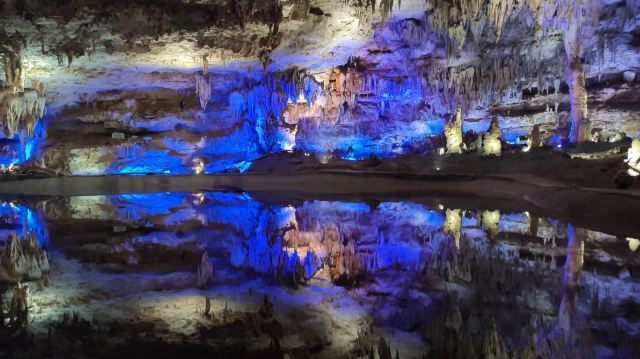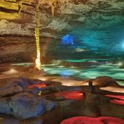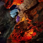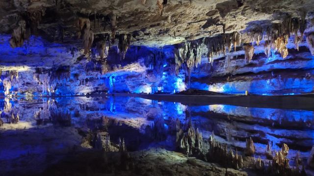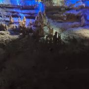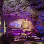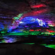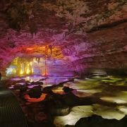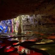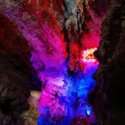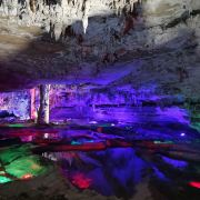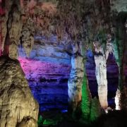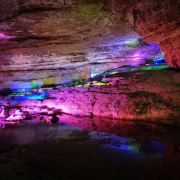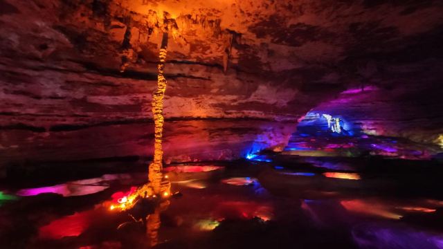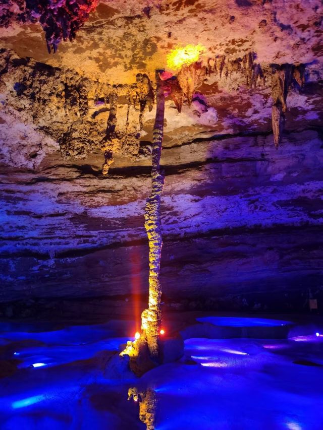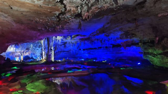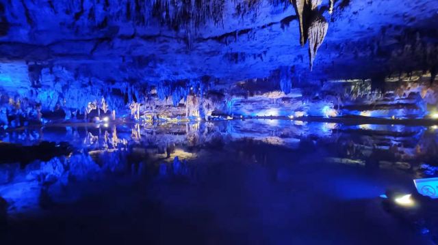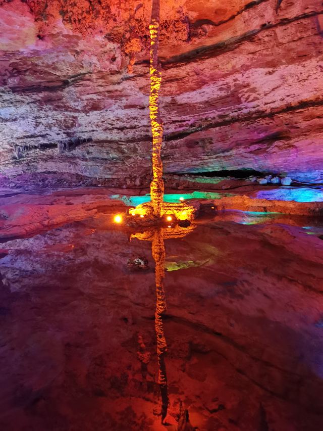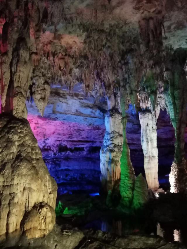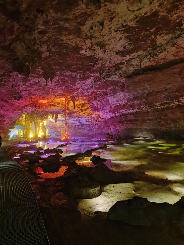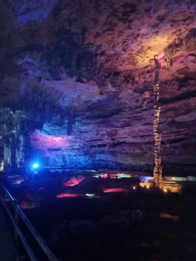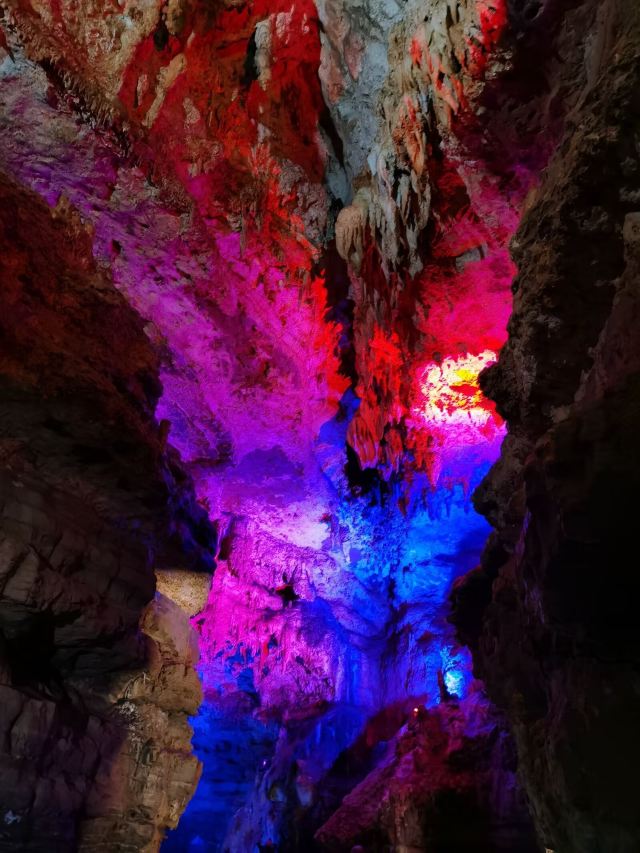洞内温度适宜,空气中弥漫着湿润的气息。五光十色的灯光将溶洞装点得如梦似幻,形态各异的钟乳石在光影交错中更显神秘。有的如擎天巨柱,直插云霄;有的如层层梯田,错落有致;还有的如瀑布飞流,气势磅礴。每一处景观都令人惊叹大自然的鬼斧神工。