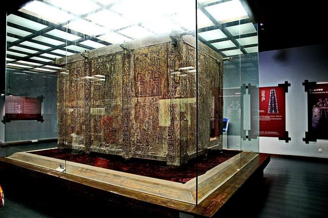 曾侯乙墓为中国战国初期曾(随)国国君乙的墓葬。随州市曾侯乙墓遗址博物馆位于湖北随州市擂鼓墩。葬于公元前433年或稍后。1978年发掘。墓坑开凿于红砾岩中,为多边形竖穴墓。南北16.5米,东西21米。内置木椁,椁外填充木炭及青膏泥,其上为夯土。椁内分作东、中、北、西四室。东室置曾侯乙木棺,双重,外棺有青铜框架,内棺外面彩绘门窗及守卫的神兽武士。中室放置随葬的礼乐器。北室放置兵器及车马器等。西室置殉葬人木棺13具。墓主45岁左右;殉葬者为13~25岁的女性。