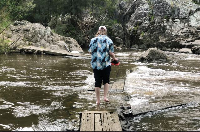 走一条比较窄的两边都是悬崖的石头路,朋友因为恐高