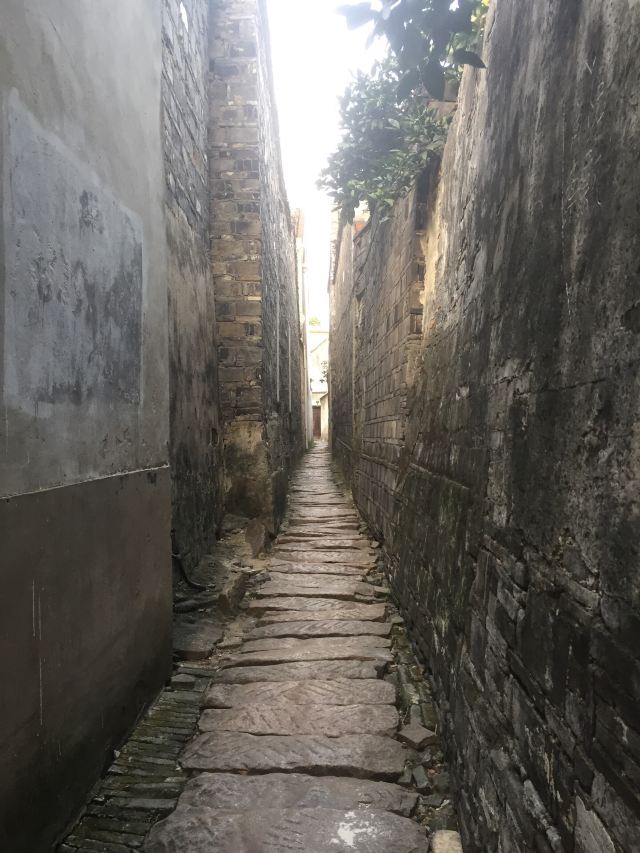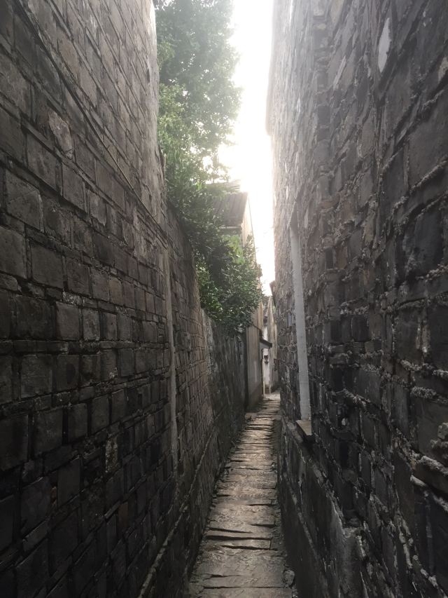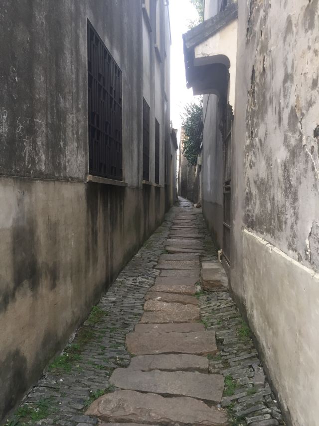 巷子的两边是高达三米的高墙,灰白斑驳,长有青苔;脚下是青色的石板。行走在穿心弄里,光线幽幽,充分体现了古镇宁静悠闲的情调。
