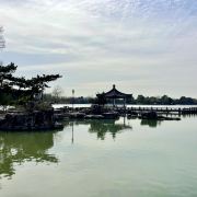 从尚湖风景区主(南)入口进入尚湖后,过太公岛、月堤便到了拂水山庄。山庄是现代根据钱谦益的诗作,将原来山庄景物一一恢复的新建筑,前半段主要是各种亭台楼阁,后半段围进了湖水,比较开阔。