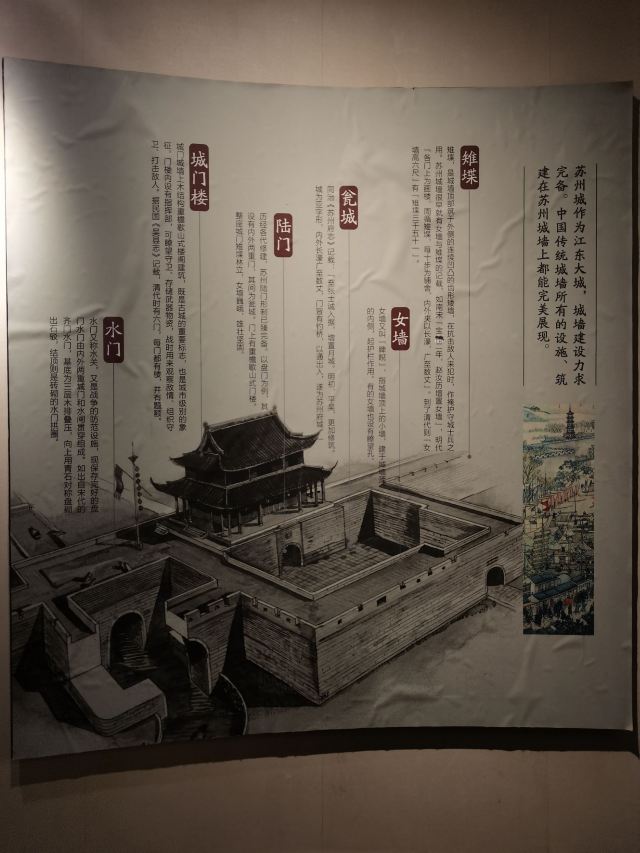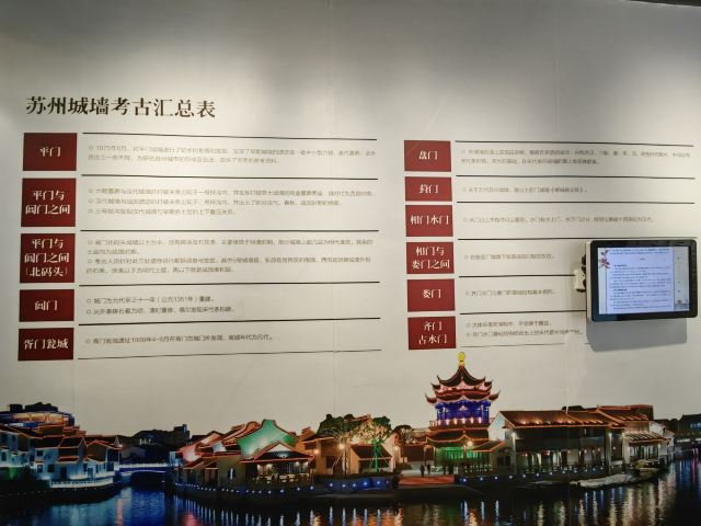 苏州城墙博物馆位于苏州相门段城墙南段城墙的中空部位。博物馆展陈区包括上下两层,面积近1400平米,分“序厅”、“城纪千年”、“城门故事”、“城里城外” “城头记忆”和“城墙复现”六个展厅,展示了苏州城墙的历史变迁和考古成果,配有很多的图片、模型和部分实物。