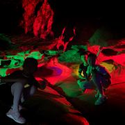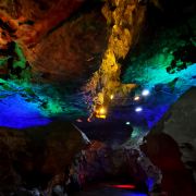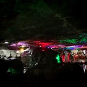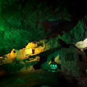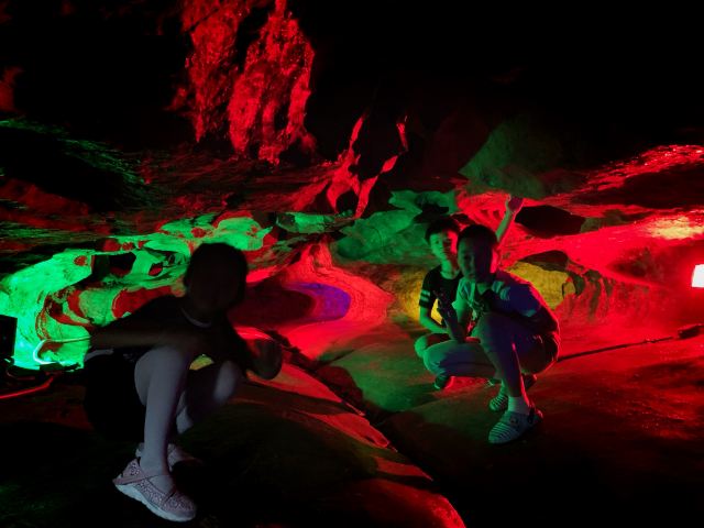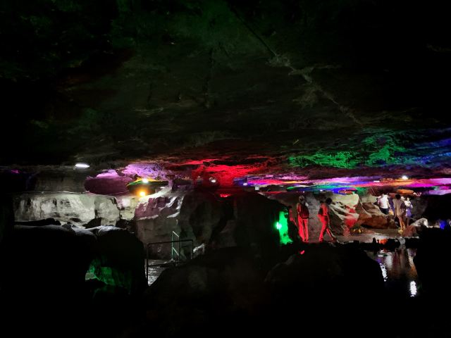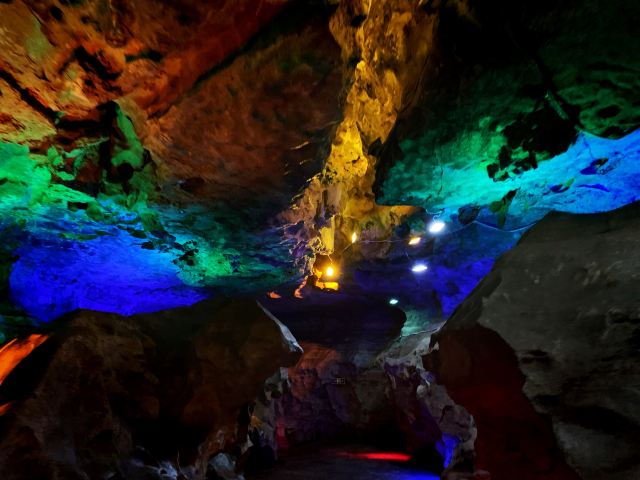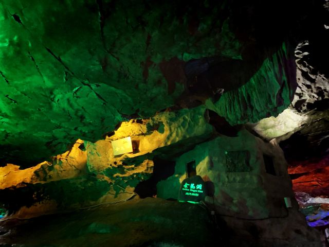 跨过水上的几块石头,便来到天后别宫洞,这里有一些水景可看。然后到达林屋洞景区-金龙洞,洞顶的一道裂隙中有不少石花、石柱,整体像一条龙,该洞出土过道教投龙仪式所用的金龙,真迹在苏州博物馆有看。沿着180度转弯的道路经过丙洞,最后到达阳谷洞,是一处相对宽敞的“厅堂”。出林屋洞的道路狭窄且洞顶很低,注意别碰头,洞顶有一些石花可看。
