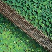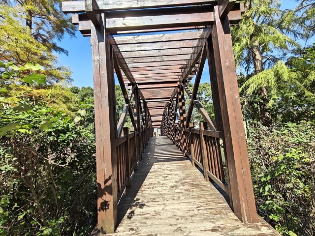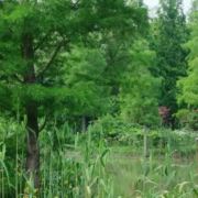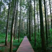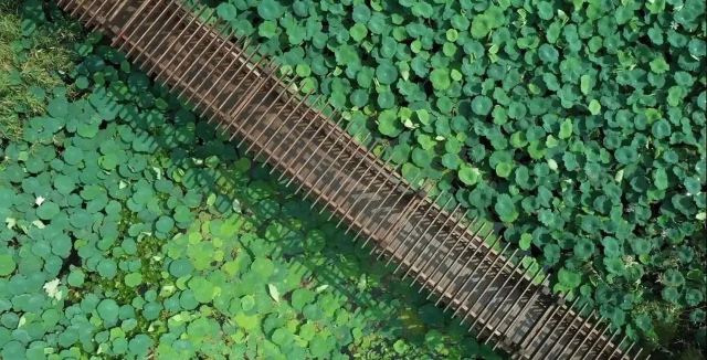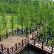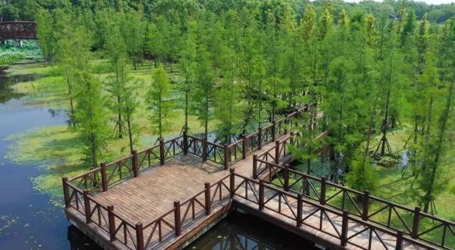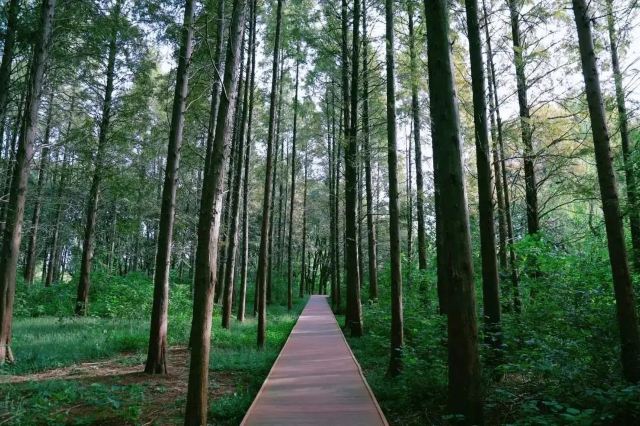 穿梭在水上栈道,两旁是高大翠绿的池杉树