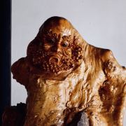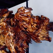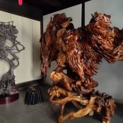 宅内还有根雕馆,设有众多中小根雕精品,分自然风格厅、各种佛像厅、动物厅三个厅。楼下根雕厅内居中是大型根雕“南海奇珊”,中间坐着笑弥陀,高2.7米,宽3.4米,佛光普照,面带笑容,左手托着元宝,喜气洋洋。