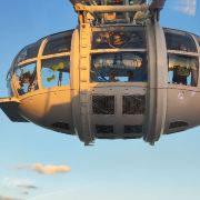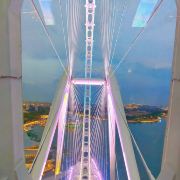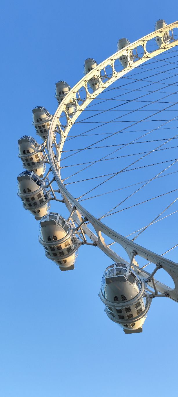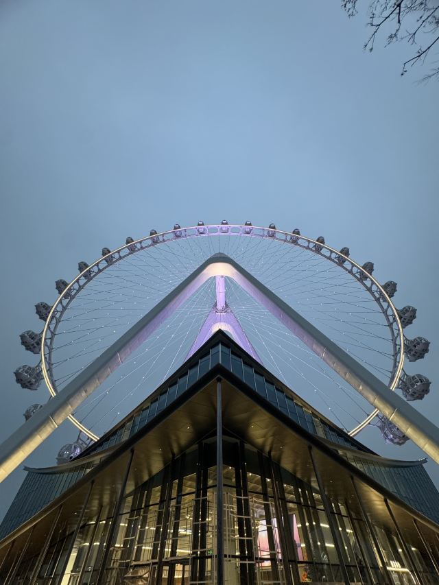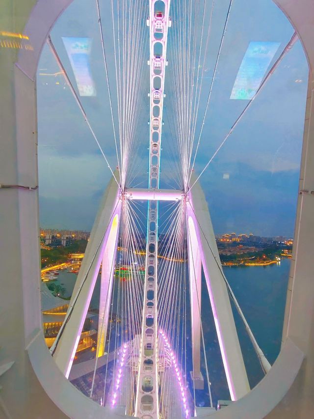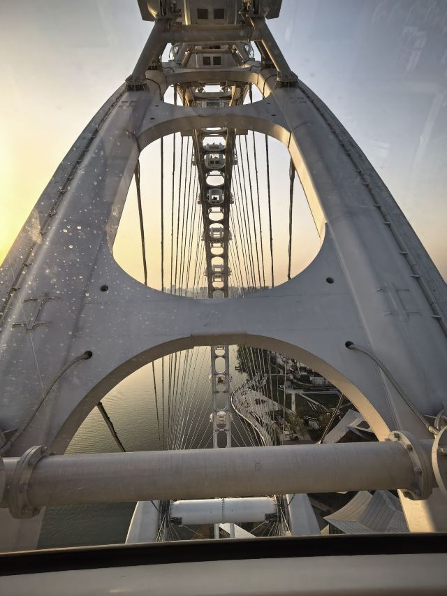 傍晚六点半的风是懂浪漫的,刚到苏州之眼脚下,就被金红色的晚霞裹了个满怀。排队时抬头望,摩天轮像巨大的彩色齿轮,一格格嵌着渐暗的天色,座舱里透出的暖光,倒像是天上掉下来的星星碎片。
