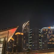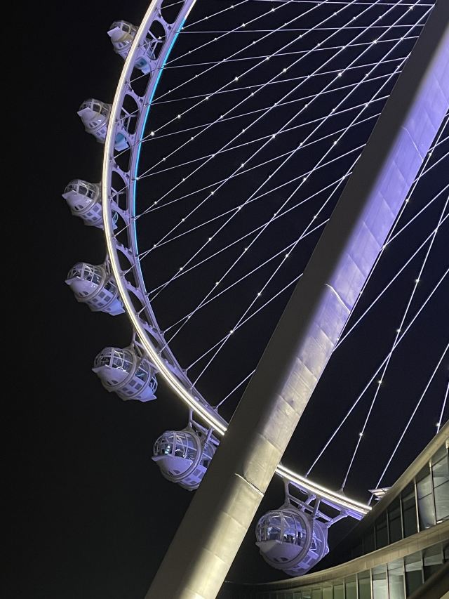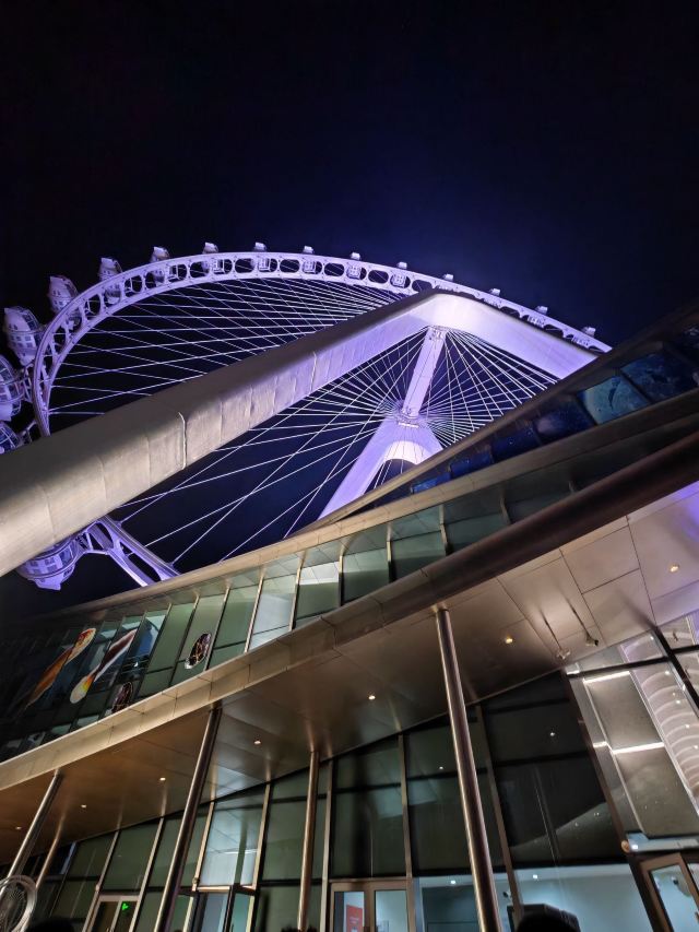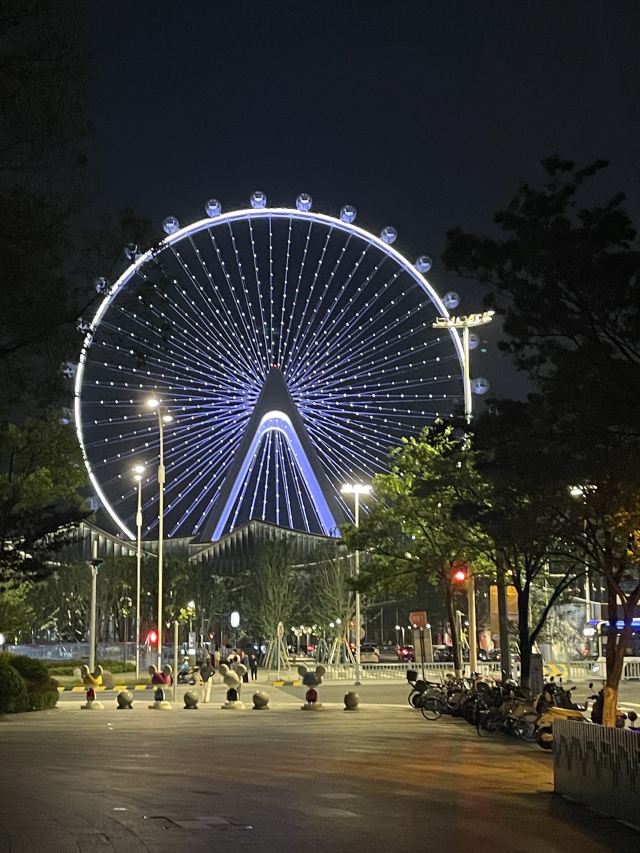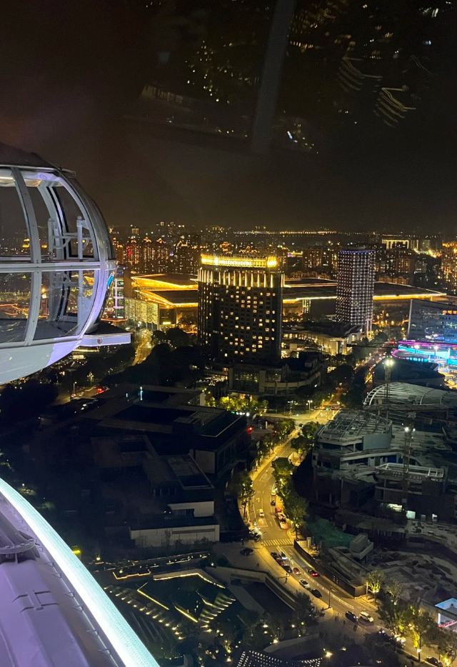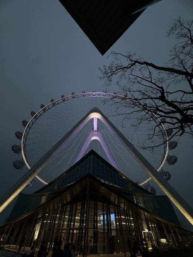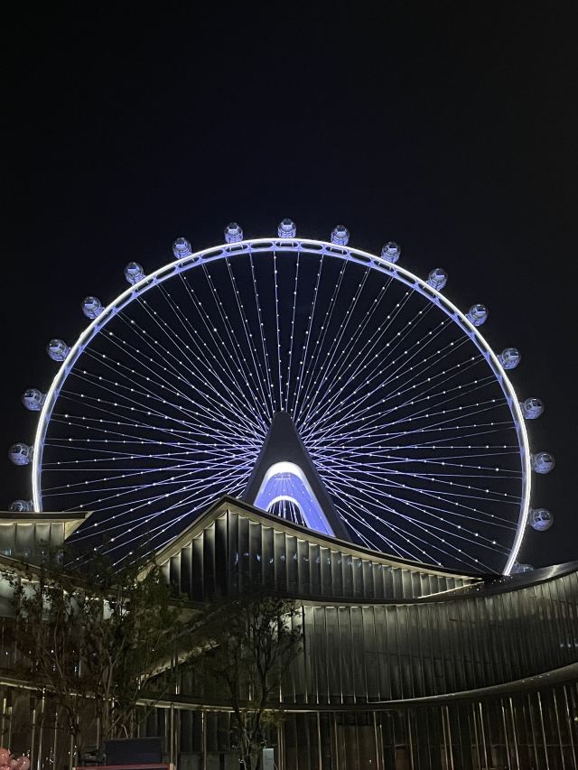 等到摩天轮慢慢下降,天已经完全黑透了。座舱里的暖光和外面的城市灯火交叠,远处的桥梁、游船、高楼的轮廓都浸在温柔的夜里。下舱时回头看,苏州之眼亮着五彩的光,在夜空中慢慢转动,像在给这座城市的傍晚画一个温柔的句号。原来浪漫从不是刻意寻找,是刚好赶上的晚霞,是高空里的一阵风,是和这座城市一起,慢慢等一场夜色降临。