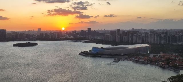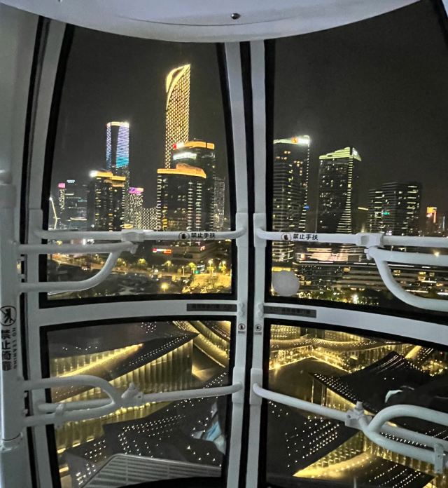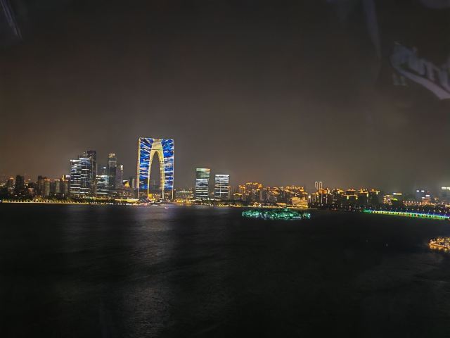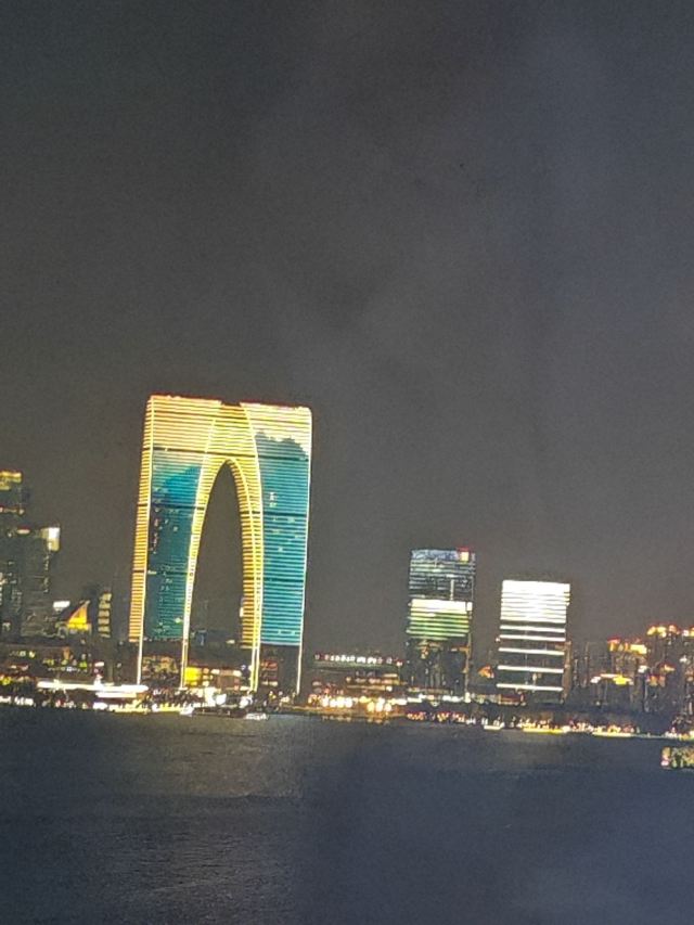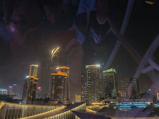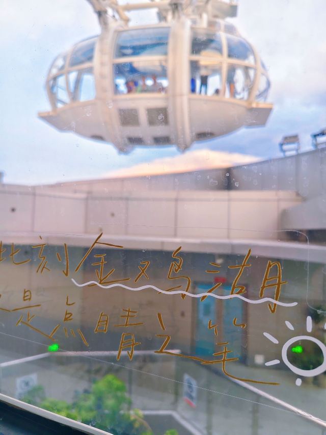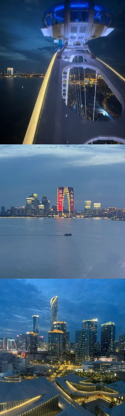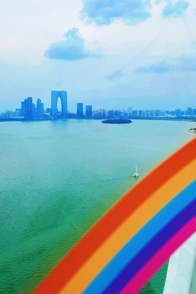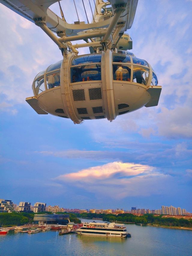终于坐进舱里,随着座舱缓缓升高,视野里的风景慢慢铺展开来。脚下的金鸡湖开始泛着粼粼波光,远处的东方之门渐渐变成线条柔和的剪影,岸边的路灯一盏盏亮起来,连成金色的丝带绕着湖转。风从舷窗钻进来,带着湖水的潮气和远处夜市飘来的糖炒栗子香,刚想掏出手机拍照,又忍不住放下——怕错过座舱转到最高点时,晚霞把整个苏州染成橘粉色的瞬间。