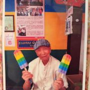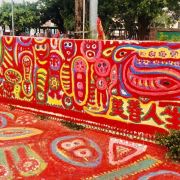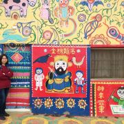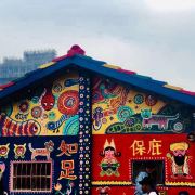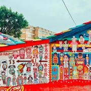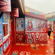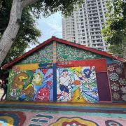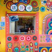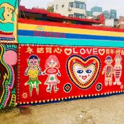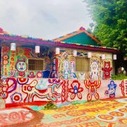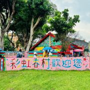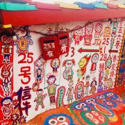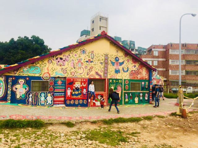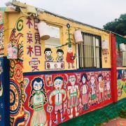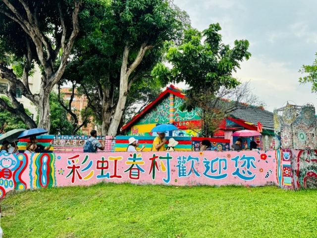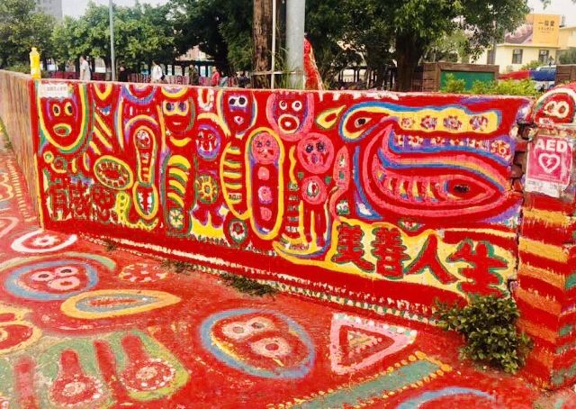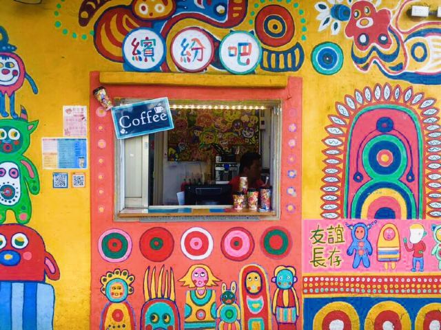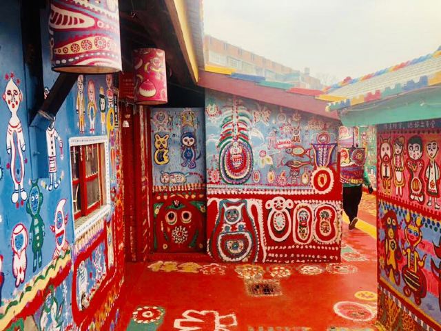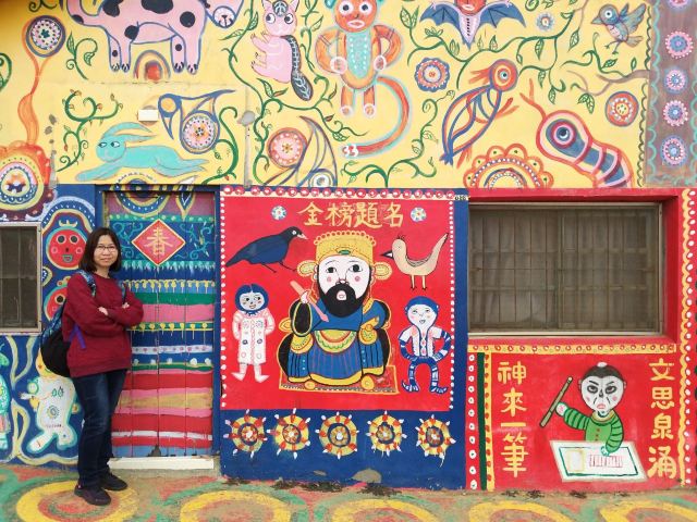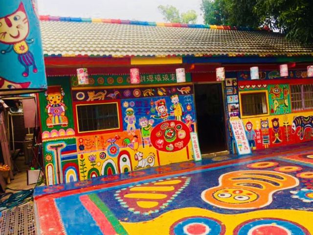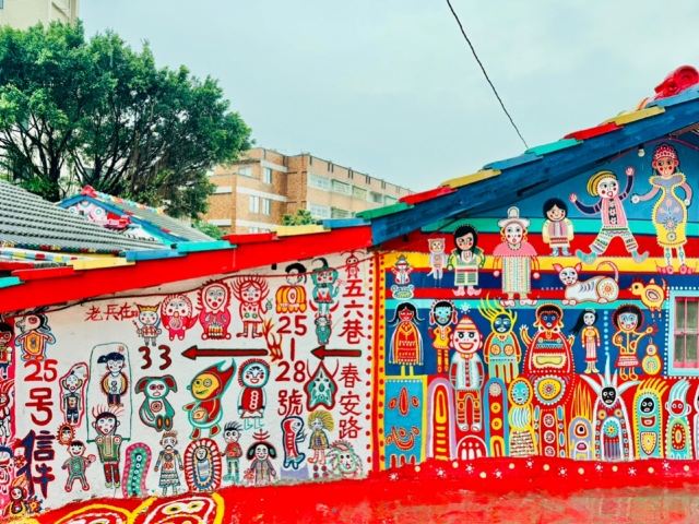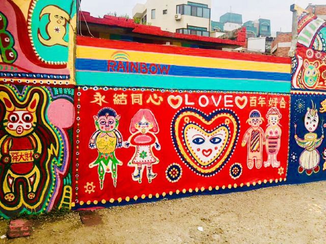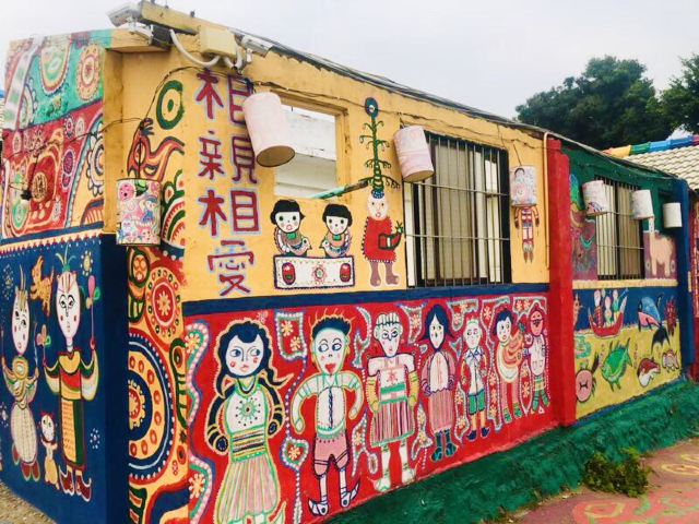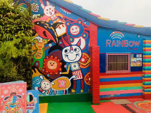 村口那条数十米长的巷道是“彩虹爷爷”作画较多的地方,也是热闹的地方。黄永阜先生的家就在这条巷子里,很容易就可以找到,因为他家的大门上已经贴满了游客留给他的字条,上面写满了祝福的话语:“彩虹爷爷,您的创作让平凡的眷村有了不平凡的色彩”,“画得好漂亮,请继续缤纷下去吧。”
