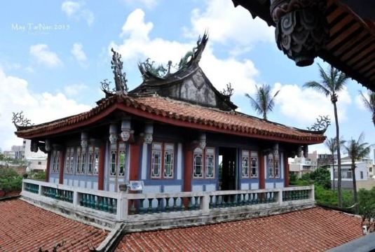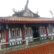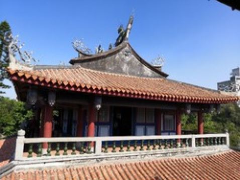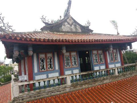 赤崁楼建筑群庭院南面的海神庙和北面文昌阁,是两座红瓦飞檐的中国传统建筑,悬挂“赤崁楼”门匾的阁楼就是海神庙,内部陈列着有关赤崁楼的文史资料,绕道海神庙的后门,有两个像花瓶形状的门洞,代表“平安”的意思。