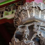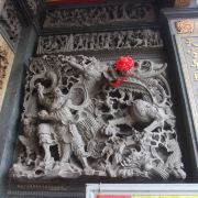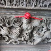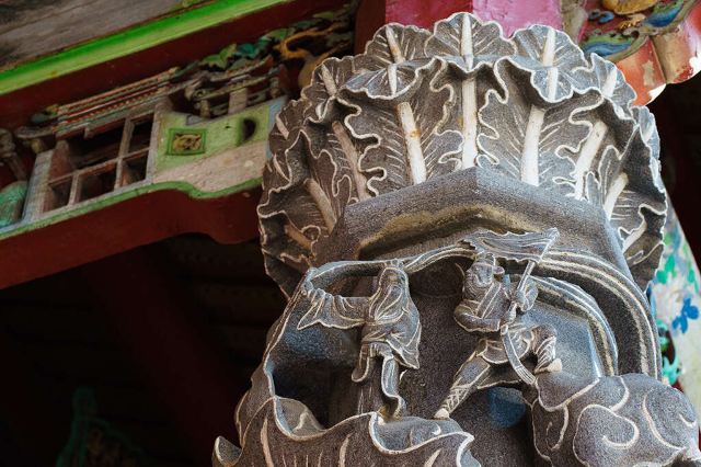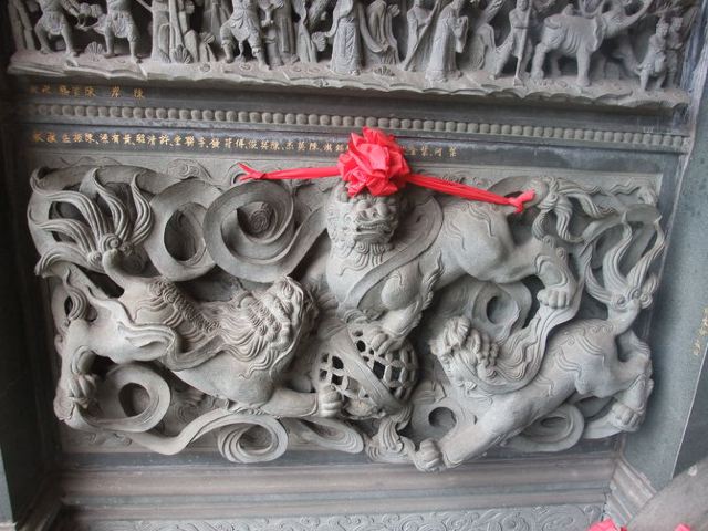 来到正门前,首先看到的是门前一对石狮,刻工精细,造型独特。入口大门高而威严,并没有传统庙宇的彩绘门神,却装有许多突起的木质乳钉,两侧是由花岗岩雕刻的八骏马和龙虎图,雄浑粗犷。