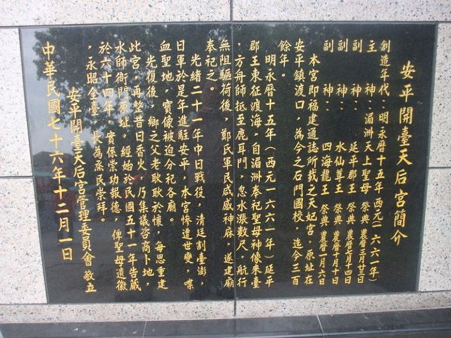 微信小程序大天后宫俗称台南妈祖庙,建于清康熙23年(公元1684年),原为明宁靖王府邸,琅率军平定台湾后将功劳归于妈祖,将这里扩建为宏大的妈祖庙。天后宫历经了数次整修,被列为台湾地区古迹。