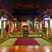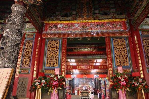 由正殿大门朝里望,透过逐次升高的天井和房舍狭长的空间可以遥见那香烟缭绕、金黄帷幕下的全身妈祖神像。妈祖慈眉善目,神态安详。据说妈祖原来是粉红面,但经百年来受香火的薰绕,现在看到的妈祖已成了黑色的“香烟面”了。这座神像是约300年前一位泉州师傅所做,可说是台湾泥塑雕像的代表之一。妈祖神像两边的神龛里还供奉着东、西、南、北四海龙王和水仙尊王。