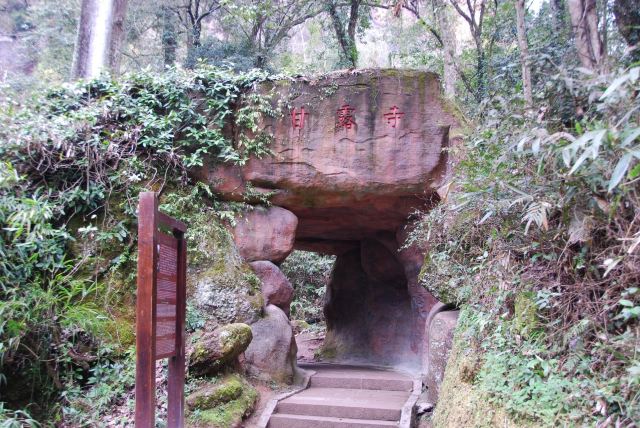 甘露岩寺隐藏于赤石深壑之中,左边一块红色岩石象一口大钟,右边那块像一面巨鼓,有“右鼓左钟,妙(庙)在其中”的说法来形容其地理位置。钟鼓石前有三棵古松,岩寺的山门碑刻上题有宋朝进士邹恕赞美寺庙建筑特色和景物的诗作。