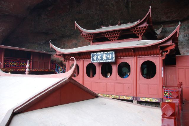 甘露岩是一个天然的内窄外敞的洞穴,高约80米,深30米,呈倒三角形。宋绍兴十六年(公元1146年),了凝和尚依附岩壁建寺,把地理上的劣势变为建筑上的优势,以独木擎天解决岩势上宽下窄的难题。一根柱子落地,上面建起了四幢楼阁,整个重檐歇山式的层楼叠阁包括上殿、 蜃阁、观音阁、南安阁等建筑,皆仗一柱支撑,顶部无需片瓦,造型别具一格。寺庙的全部建筑都是木质的,用T形拱头相连接,没有用一根铁钉。