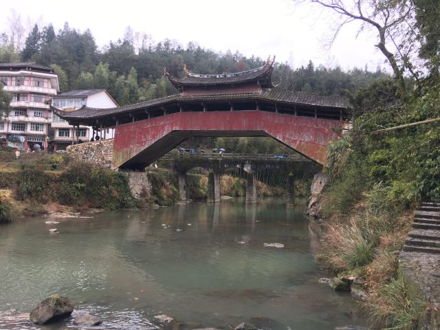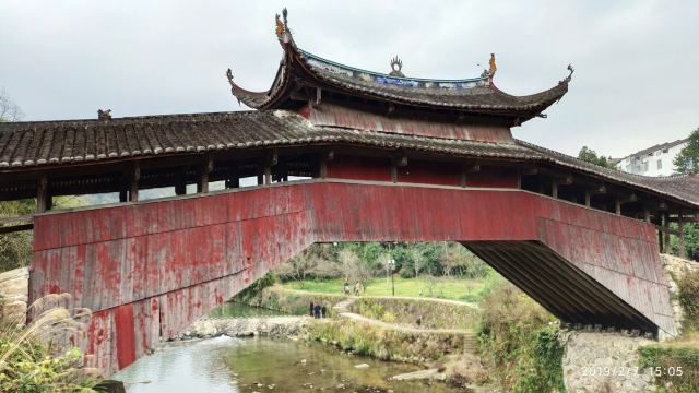 桥下溪水清澈,桥的另一侧是一抹远山,近处有两座高山,狮子缝与将军峰。据当地人讲,此桥与其周围环境形成了“将军逗狮”的风水模式。红色的桥身映衬在青山碧水中,更显轻灵秀美。