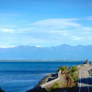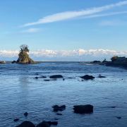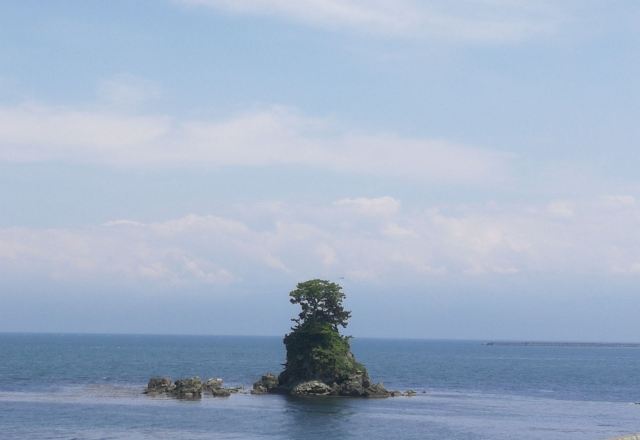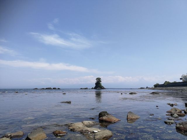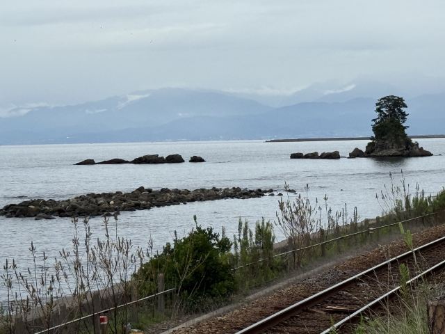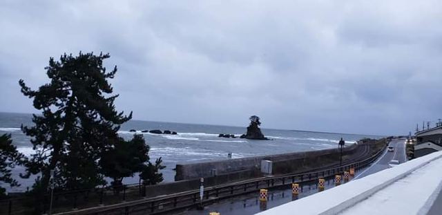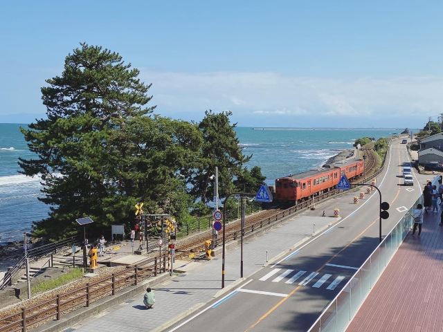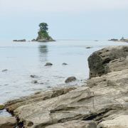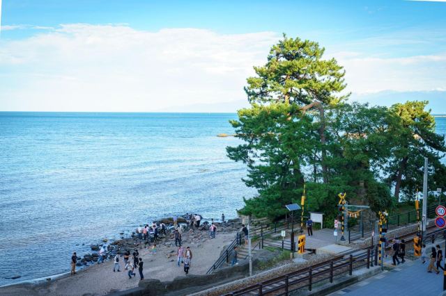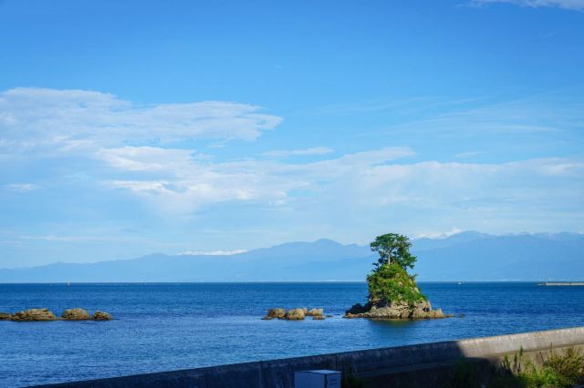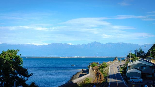 海岸以富山湾的泰山山山脉风景如画而闻名。晴朗的日子里,积雪覆盖的山峰似乎漂浮在海上,提供了日本最具标志性的海岸景观之一。海岸上布满了松树,点缀着岩石的地层,使它有了一种和平的、几乎永恒的气氛。