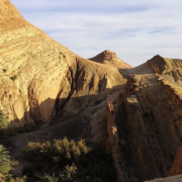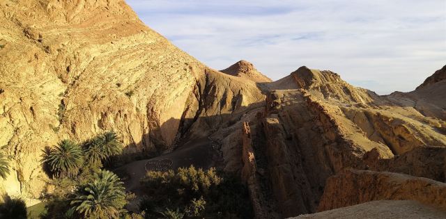 离开托泽尔市区不久便进入了广袤的戈壁。开始公路两旁还能看到一丛丛的绿色植物,攀爬在小小的沙丘上,这之后视野中尽是成片的盐碱地苍苍茫茫。歇比卡是先到达的山脉绿洲。这里的海拔高度约为27米,适宜的气候生长出很不错的椰枣。1969年,一场罕见的大雨袭击了这一地区,原来的小村庄在大雨中完全被毁。现在从山顶能够看到的,是重建的新城。沿着后山的小道能够找到整片绿洲的源头,潺潺的流水,翩跹的蝴蝶,甚至一个不太大的瀑布,漫天黄土中的世外桃源令人惊叹不已。