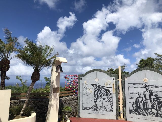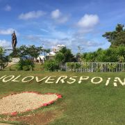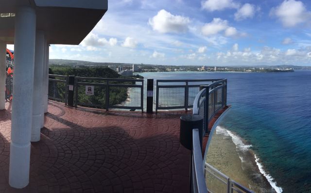 观景台上有一处白色小凉亭,站在小凉亭内可以远眺整个杜梦湾,从高处俯瞰关岛海岸线。远处,可一览半月形杜梦湾令人着迷的白沙海滩。小凉亭下方有面彩色墙,不少恋人在此留下爱的誓言。