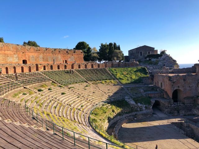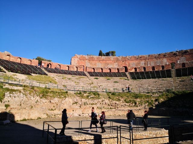 5分 超棒中餐厅取景地的陶尔米纳有个保存完好的希腊露天剧场,剧场呈圆形,从剧场内可以远眺艾特纳火山,如果天气状况良好可以看到火山冒烟,剧场外围可以看到整个陶尔米纳。