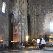 从宏观看完,我们顶着烈日返回修道院,进入内部参观。整个修道院局部正在维修,搭的脚手架非常影响拍照效果。走进修道院看到高大的教堂非常宏伟,尤其是入口的石柱雕刻的工艺精湛,类似的修道院还是第一次看到。这里在1931年曾遭受大地震的破坏,在陈列室里有当年的照片,院落中有一个地震柱是当年的幸存。在这个教堂里牧师也在为游客和信徒赐福,人们在这里的顶礼膜拜一点不亚于城市内的大教堂。这个修道院的院落内周边还有不少互通的房间可以参观,虽然这些房间空空荡荡,但它们临山崖从窗户或平台可见山谷和对面山坡的风景。这座修道院当年也是赫赫有名的大学,在13-14世纪,Tatev修道院大学成为了亚美尼亚中世纪最重要的大学之一。据说在那个年代,Tatev修道院大学的办学标准在亚美尼亚是前所未有的高,因此这里培养出当时最重要的学者Grigor Tatevatsi,而Grigor Tatevats墓现今仍在修道院内,院落中有他的石棺。直到15世纪的Tatev大学,其仍然对促进亚美尼亚的科学的进步、宗教、哲学、书籍的发展有着重大的贡献。