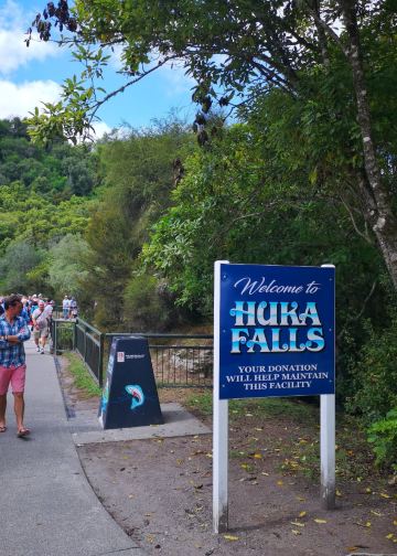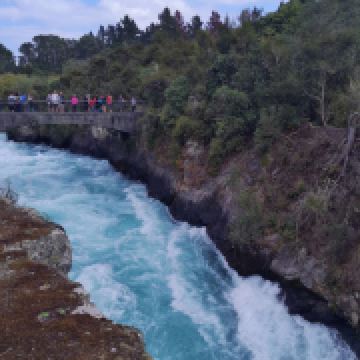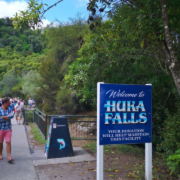 经由新西兰的陶泊市附近公路可达水量充沛、气势磅礴的胡卡瀑布,怀卡托河由12公尺高的河道断层冲泻而下,造成每秒230吨巨量的水流,浅蓝如宝石的怀卡托河因隘口及断层的作用,产生喷射及向下的巨大动力,形成泡沫般的水瀑宣泄而下,故当地人称此瀑布为“Huka”,也就是泡沫的意思。