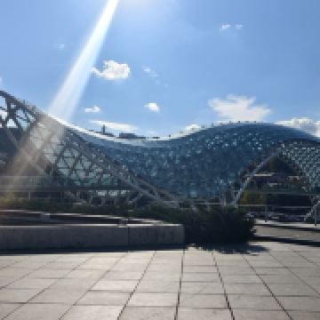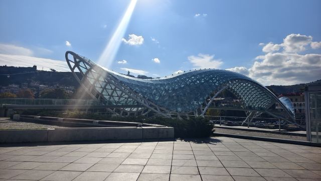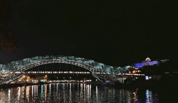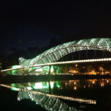 这座桥连接第比利斯的新城和老城,全长150米,也是第比利斯为数不多的现代建筑。它是由意大利建筑师Michele De Lucchi设计,桥体采用钢与玻璃的混合结构,顶棚高150米,拥有交互式的灯光显示系统,包含3万个LED灯和240个传感器,每小时会根据特殊的信号沿着桥梁的两个护墙依次闪烁,类似莫尔斯电码,象征着人体的化学元素以及人类的生命与和平。