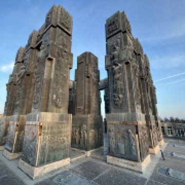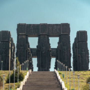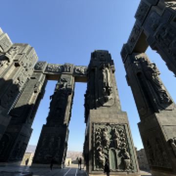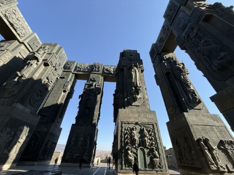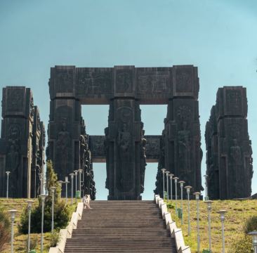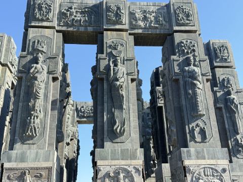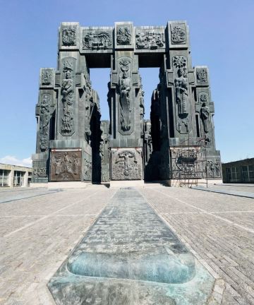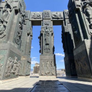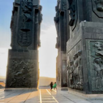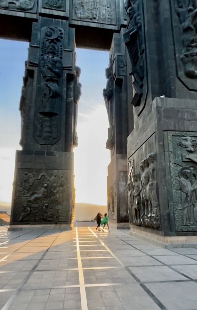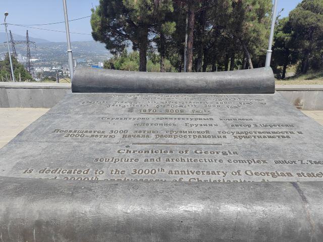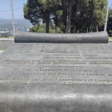 格鲁吉亚纪事纪念碑是由16根高35米的青铜柱子组成,每根柱子由三部分组成,底部浮雕描绘的是圣经里的人物和场景,中部是一位在格鲁吉亚历史上有重要意义的人物,人物身份包括圣人、国王、诗人和军人,顶部则描绘格鲁吉亚人的节日庆祝、粮食与葡萄丰收等日常场景。格鲁吉亚纪事纪念碑修建于紧靠第比利斯海西北角的Kenisi山上,后在旁边修建了圣母领报教堂(Annunciation Church),从此处可以俯瞰整个第比利斯海。