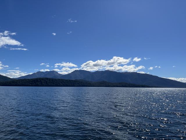 5分 超棒进入洞内,仿身置银河下,童年的荧火虫冷蓝光的记印重回脑海。船行驶在蒂阿瑙湖上,河岸二边树木茂盛,远处雪山清晰可见
