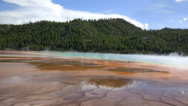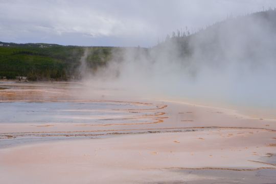 上间歇泉区再往南则是中间歇泉区,景观「大棱镜温泉」(GrandPrismatic Spring),池面直径达115公尺,水温高达86℃,是黄石公园面积大的温泉池,色彩缤纷艳丽,有如彩虹般的红、澄、黄、绿、蓝、靛、紫等七彩色,沿着池畔的木板步道,可以一览大棱镜温泉的奥妙,在大棱镜温泉附近的木丝间歇喷泉(Excelsior Geyser),是黄石公园内喷水的喷泉,其记录是90公尺,然而上一次喷出时间是在1983年。其它景观如:Opal Pool、Turquoise Pool等。