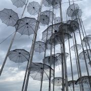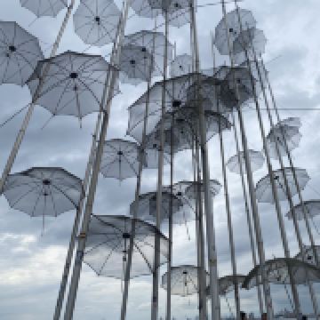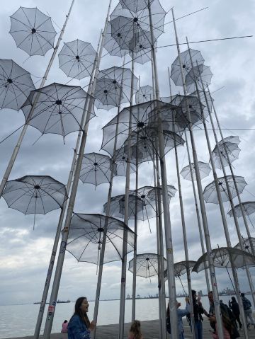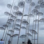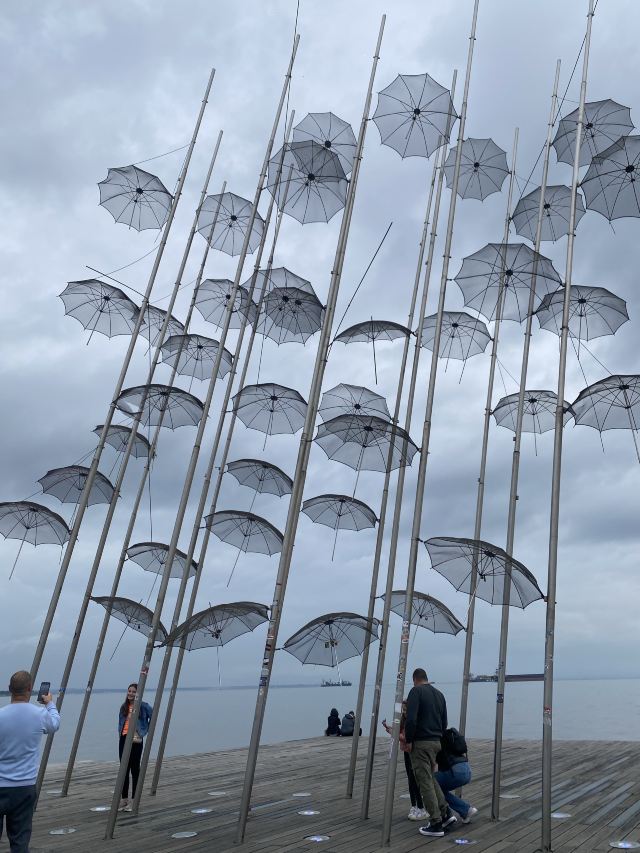 The Umbrellas by Zongolopoulos是希腊雕塑家乔治·宗戈洛普洛斯于1995年创作的钢制雕塑装置,高约13米,由不锈钢制作。作品在1995年威尼斯双年展展出,之后于1997年作为塞萨洛尼基海滨新长廊的永久公共艺术装置被安置在那里。雕塑由数十把金属伞组成,这些伞倾斜地固定在垂直支杆上,并辅以水平的金属杆,用以在强风中提供结构稳定性,同时象征雨滴或风的视觉元素。雕塑不仅在白天因其光泽与海景反光产生视觉效果,也在夜晚借灯光照明显得格外引人注目。其位置靠近Thermaic海湾,面向海洋与地平线,营造出宽阔感与空间张力。艺术家曾称这处装置与之于地点之间存在一种“对话”:伞这一轻盈形象在克服风与环境挑战中显得生动,而夜间灯光、白天阳光、风与云的变化都让观者在不同时间有不同体验。
