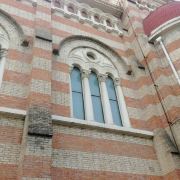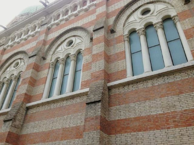 西开教堂外部用红黄相间花砖砌成,三座呈品字形排列、高耸入云的塔楼上浮盖着绿色铜片,经过岁月的冲刷,斑驳的绿色在阳光的照耀下反而闪烁出具有历史感的光彩,塔楼顶上各有一个青铜十字架。