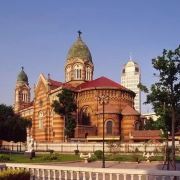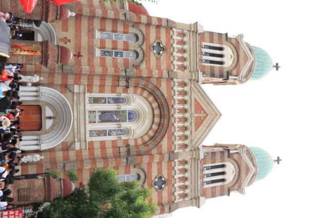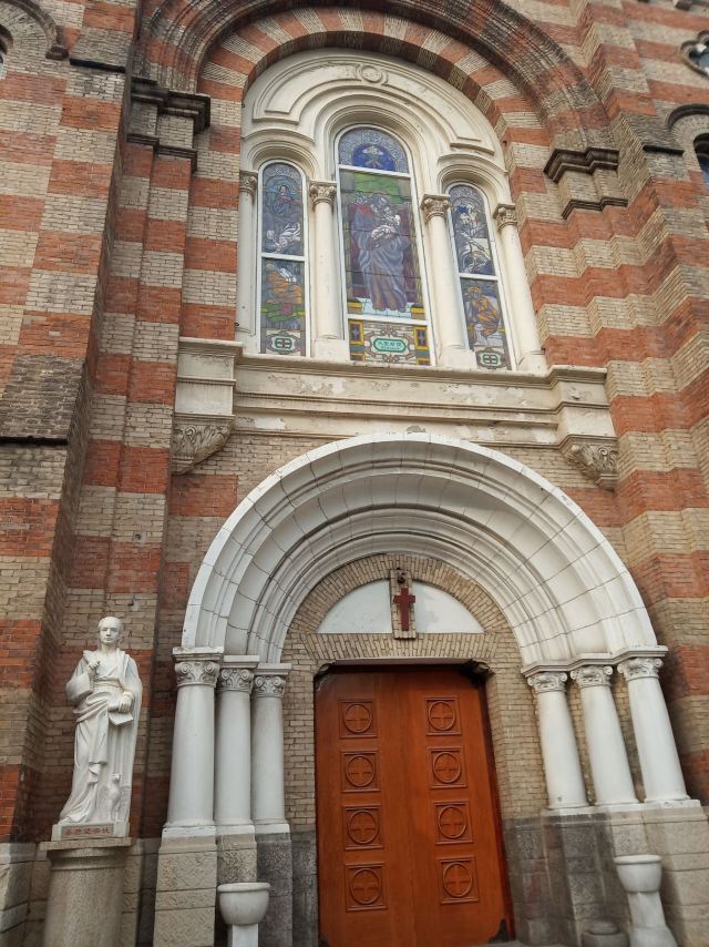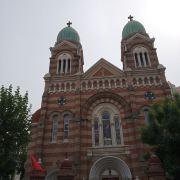 西开教堂包括天主教总堂和大教堂,分别建于1914年和1917年,大教堂采用法国罗曼式建筑造型,平面呈长十字形,正面和后部耸立高大塔楼三座,呈"品"字型,楼座以黄、红花砖砌成,上砌翠绿色圆肚形尖顶.檐下为半圆形拱窗。