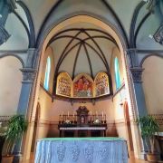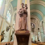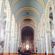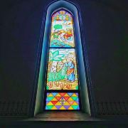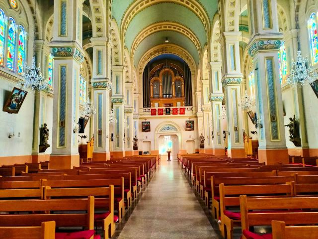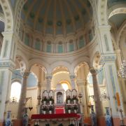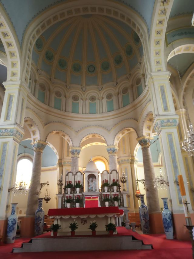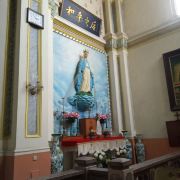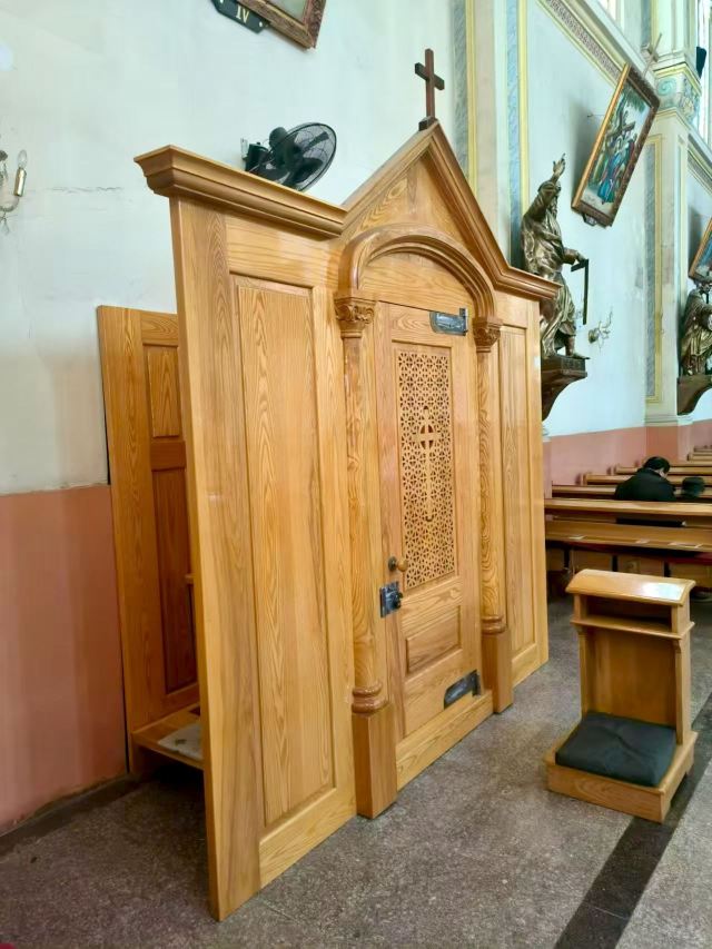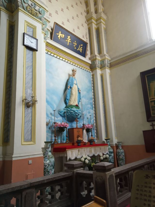走进西开教堂,映入眼帘的首先是湖蓝、白色、淡黄构成的内部主色调,给人一种清新的感觉,只在恰到好处的位置上雕刻着各种花纹,14根立柱从门口排列到祭台,气度不凡。教堂四周列着一座座精美的教徒铜像,墙壁上则挂着一幅幅记述耶稣受难故事的油画,教堂内还有圣母、耶稣、天使等的彩色塑像。另外,一扇扇彩绘玻璃窗也很迷人。在教堂的一侧你会发现一个木质小房间,顶上有小小的十字架,那是供神甫接待信徒忏悔告解用的“告解亭”。