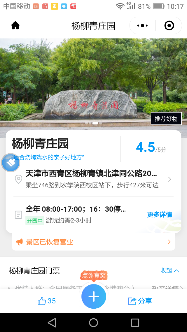 5分 超棒天津西郊的杨柳青庄园是一个特别适合周末全家人一起野餐德地方,除了又专门供游客烧烤的区域之外,孩子们游玩的项目也是非常丰富。