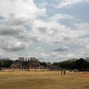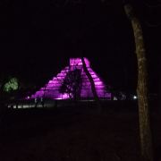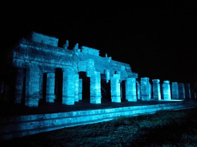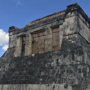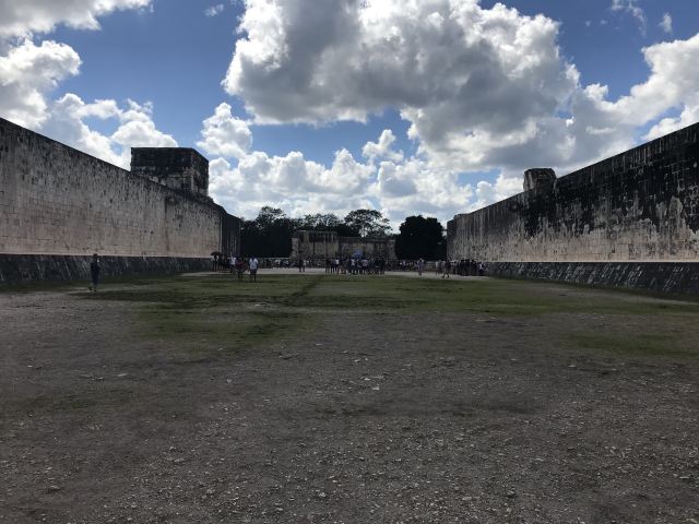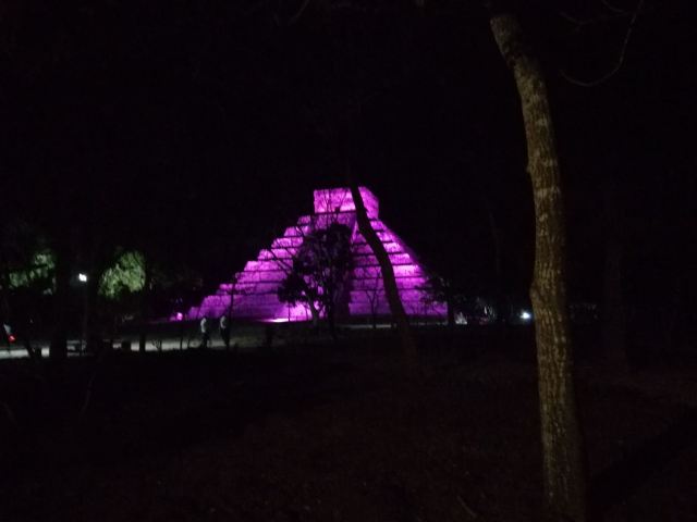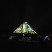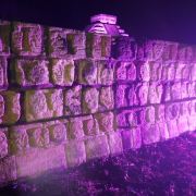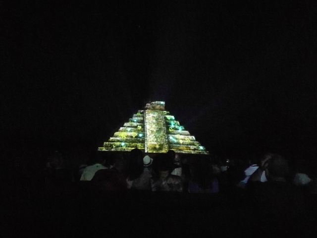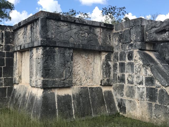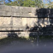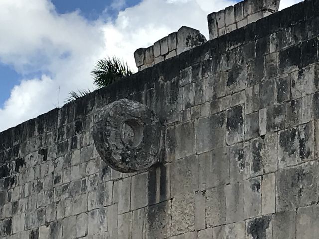 铧:"奇琴伊察玛雅遗址,建于公元六世纪,羽蛇神金字塔,春分、秋分,日出日落时,塔北面的阶梯上投下羽蛇状阴影,并随太阳的位置在北面滑行下降。图案的球戏场,球门,只能用胯部顶球,球穿过为胜,而赢球之队的队长将会献祭。"