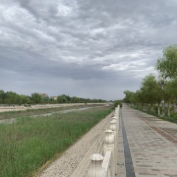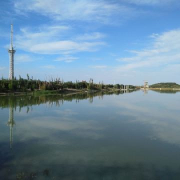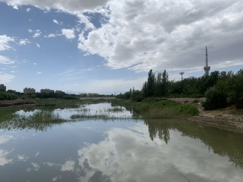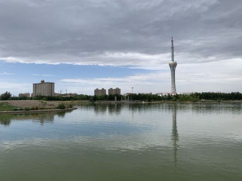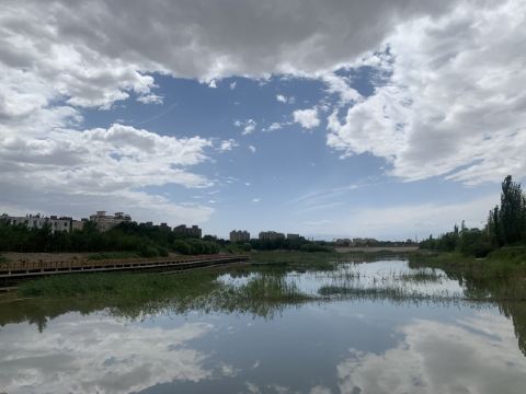 白杨河公园东西长3公里,南北宽1公里,面积非常的大,正门在西边,靠近托克逊天山明珠大酒店,进入公园,首先是一块巨石,刻着白杨河公园几个大字,巨石后是一圈整体程半圆形的花架走廊。接下来是一个截流白杨河打造的人工湖,面积不小,在托克逊这样的中国干极能够打造如此的水面,真是耗费不菲,不过也很值得。沿着湖边,是长长的木制步行栈道,环湖一圈三公里左右,景色非常优美,杏花塔、明珠酒店和托克逊县城的建筑,以及远处的山峦和天上的云彩倒影在明镜一般的湖面上,给人恍若水乡之感,谁又能想到这里是全中国最干旱的地方呢?