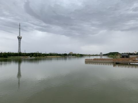 人工湖只是整个公园的西半部分,公园以人工湖的水坝分为东西两部分,西部分就是人工湖和环湖栈道,以水景为主。