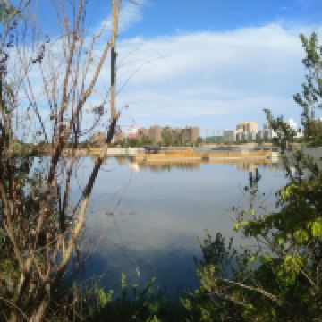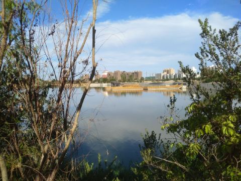 公园的东部分又分为两部分,紧挨着人工湖大坝的是一片水草丰美的湿地公园,面积比人工湖略小,与波光粼粼的人工湖不同,这里的水中大半覆盖着翠绿的芦苇荡和各种水草,蜿蜒曲折的步行栈道如彩虹飘荡在湿地释上方,给人与人工湖不同的另一种水乡体验。