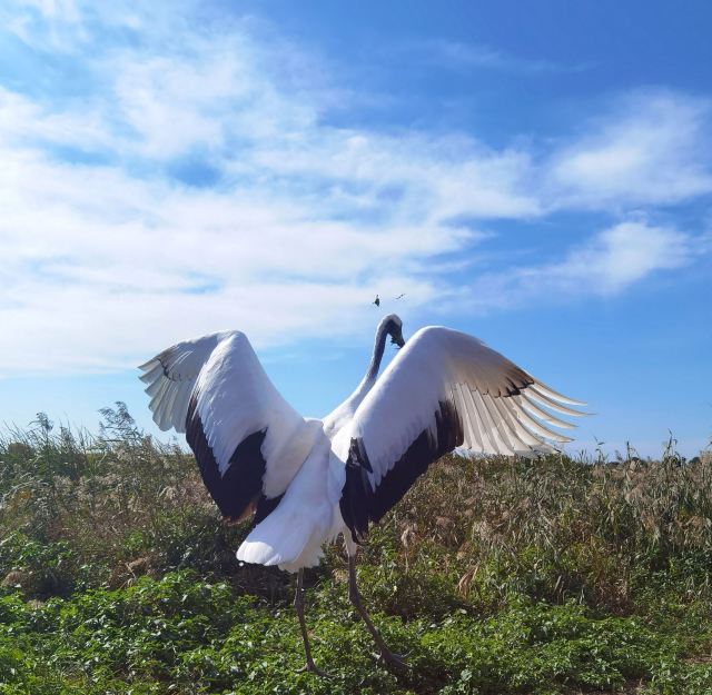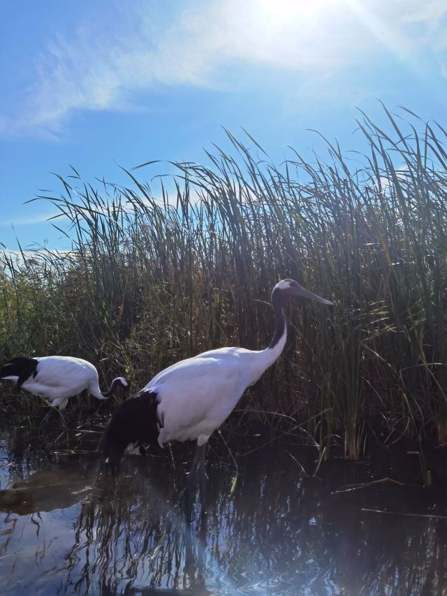 鸟类天堂:向海湿地是鸟类的乐园,这里是众多候鸟迁徙途中的重要停歇地。当清晨的第一缕阳光洒在湿地上时,鸟儿们便开始了它们欢快的歌唱。各种各样的鸟类在这里汇聚,有色彩斑斓的丹顶鹤,它们那标志性的红色头顶在阳光下格外醒目,修长的双腿和优雅的脖颈,使它们在翩翩起舞时宛如一幅流动的画卷;还有成群结队的白鹭,它们洁白如雪的羽毛在蓝天绿水的映衬下显得更加圣洁,它们或在浅滩觅食,或展翅高飞,构成了一幅生机勃勃的景象。站在湿地边,听着鸟儿们的歌声,看着它们自由翱翔的身影,仿佛置身于一个童话般的世界。