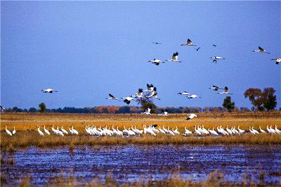 向海国家级自然保护区位于通榆县西北、科尔沁草原的东部边陲,是以保护丹顶鹤等珍贵水禽和蒙古黄榆等稀有植物群落为主的自然保护区。在这里你可以观赏到具有草原原始特色的沼泽、黄榆、苇荡、杏树林等各种自然景观,还能观赏到丹顶鹤等珍禽的优美身姿。