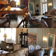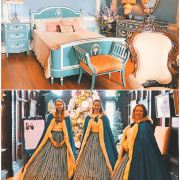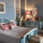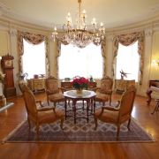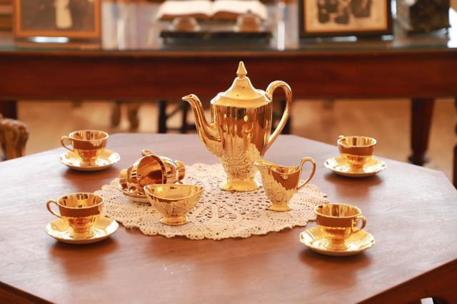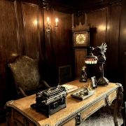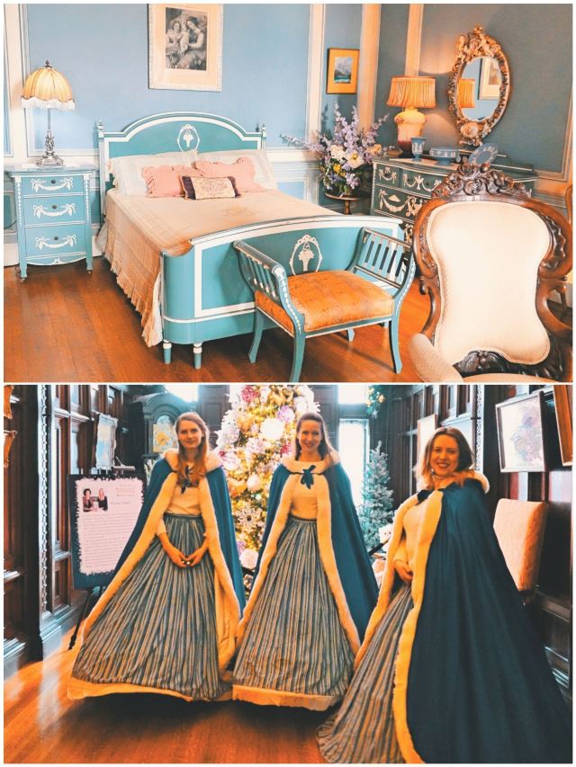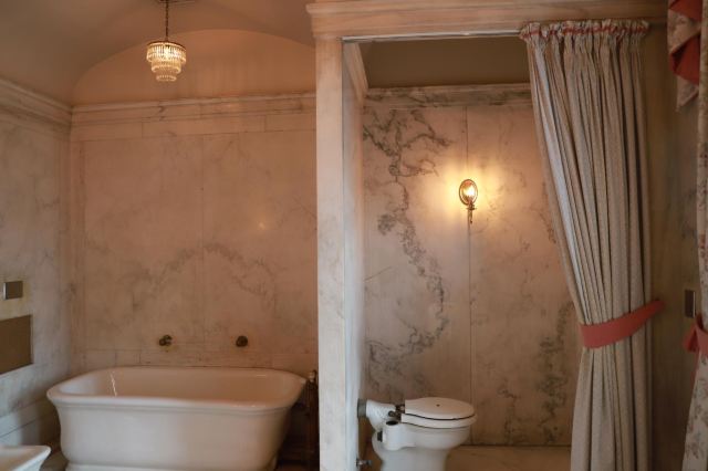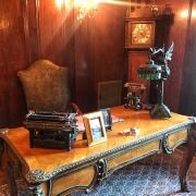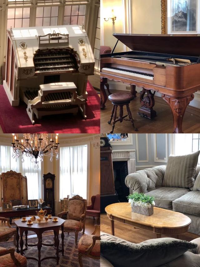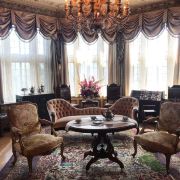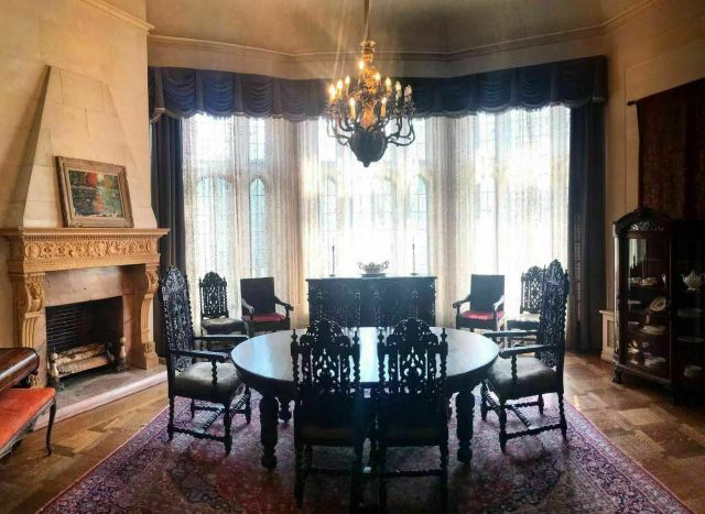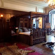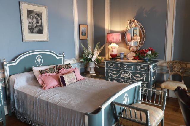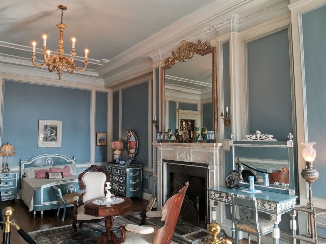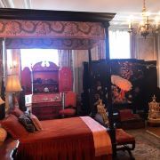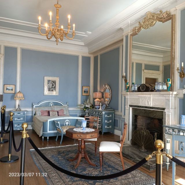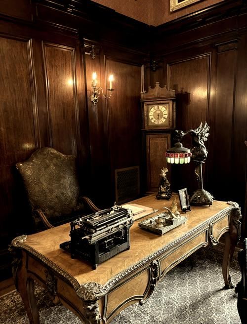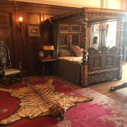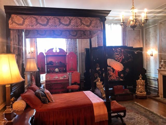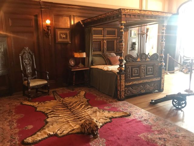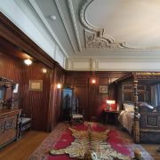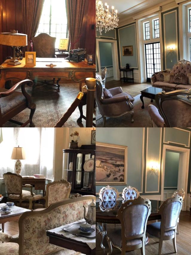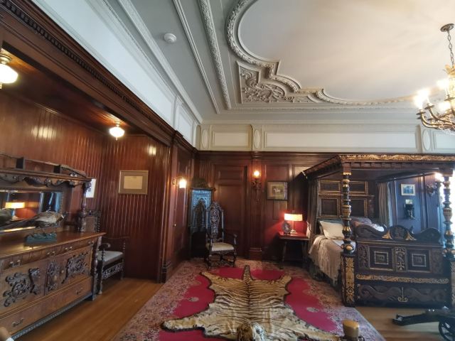 二楼以起居室、套房和客房为主。其中中式风格的套房内,摆放着许多中国漆木家具和瓷器,墙壁也以中式花纹为装饰。主卧室的天花板上,精致的蓝莓雕刻摇摇欲坠、十分逼真,虎皮地毯更是显示出主人的身份和地位。