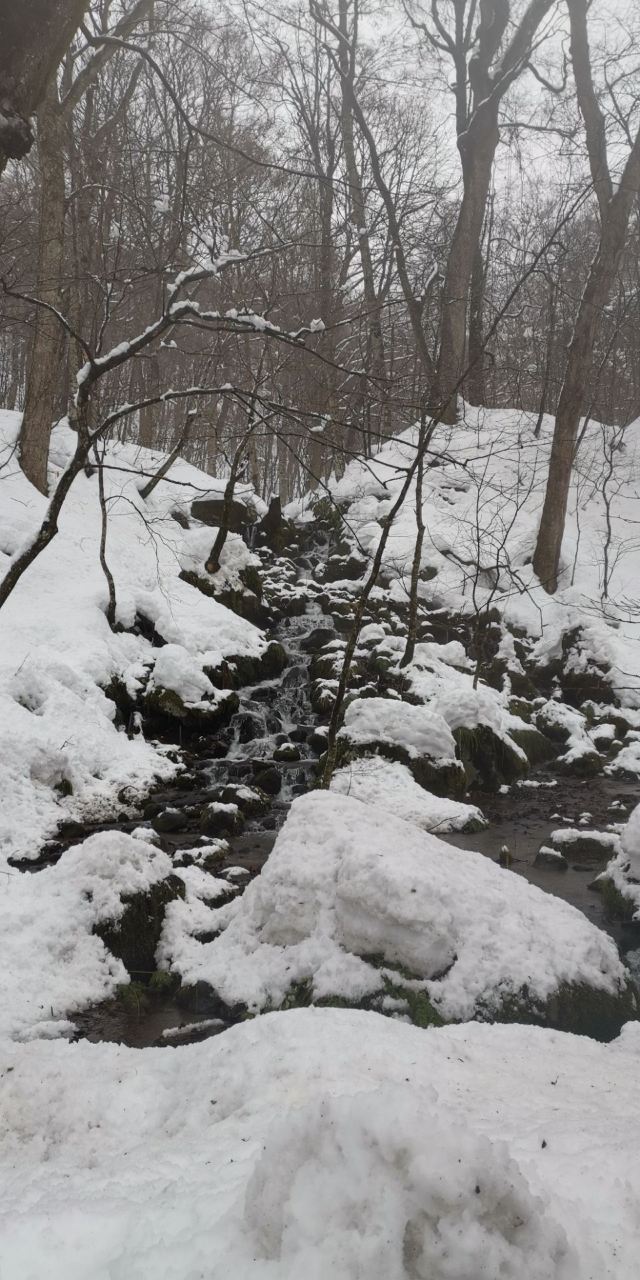 冬日的奥入濑溪流,少了绿意盎然,却多了积雪冰柱的加持。潺潺溪流,不激进,却也涌动着一股劲。四周都是枯枝,有些凄美,却也有些壮阔。