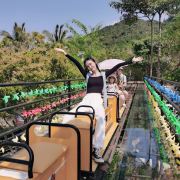 5分 超棒槟榔谷,全名保亭黎族自治县槟榔谷黎苗文化旅游区,是位于三亚北部保亭县的一个5A级旅游区。环境优美,植被茂盛,空气清晰,黎苗文化,手工银器,别具一格,导游讲解细致,增长见识,服务周到,值得一游。我这个一日游是128一位,带门票+电瓶车+滑索+中午自助餐,团费不贵,能吃饱(味道一般)。主要带孩子了解一下苗族和黎族的文化,总得来说还不错,吃完饭去自费看了一下槟榔古韵也挺好大型表演,孩子看了很震撼,这里边水果一条街也很便宜的,告诉各位千万不要在前边买水果很贵的,越往出走越便宜的,之前老公买了10块2个,后来到门口10块6个,一定记住哦!一天下来还不错了,,还不累,玩的也挺好的。